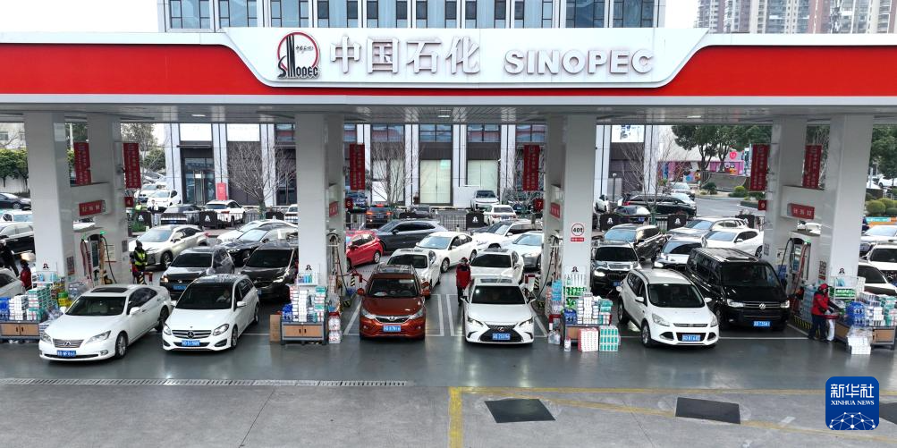 3月9日,汽车在江苏省常州市一加油站内有序加油(无人机照片)。