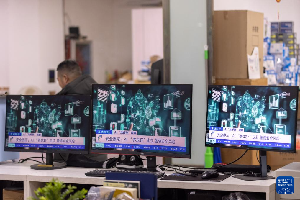 3月11日,在位于浙江省湖州市吴兴区飞英街道的颐高数码广场,电脑显示器在播放开源AI智能体“龙虾”的相关新闻。