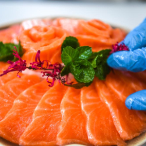 3月10日,工人在贵州省岑巩县淡水渔业基地将三文鱼切片摆盘。