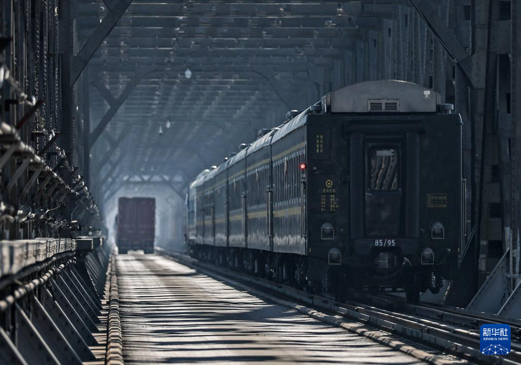 3月12日,辽宁丹东至朝鲜平壤的95次列车通过中朝友谊桥。