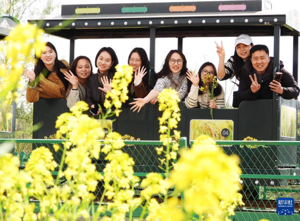 3月9日,在四川省达州市渠县有庆镇太阳村油菜花田间,游客乘坐小火车观赏油菜花。