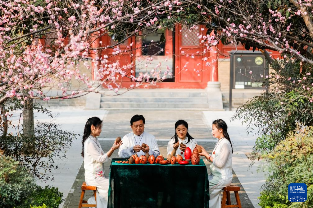 3月12日,河南省武陟县嘉应观黄河文化博物馆工作人员在花树下制作泥埙。