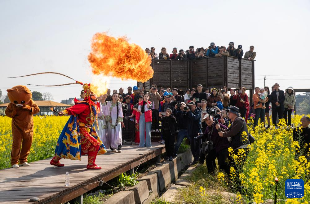 3月11日,在四川省成都市彭州市九尺镇石泉村积谷仓油菜花田间,演员为游客表演川剧吐火。