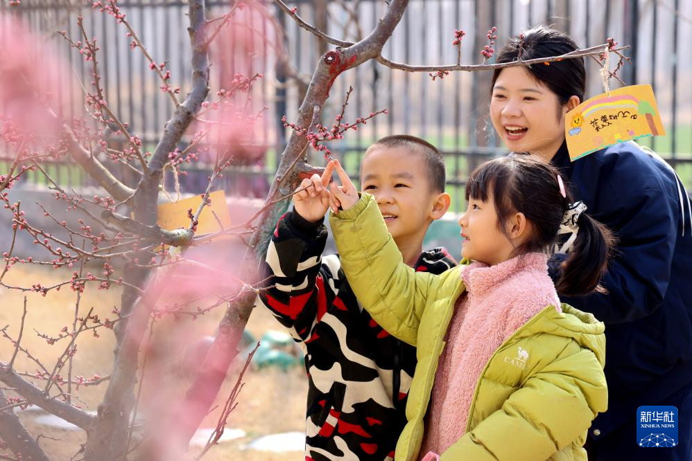3月12日,山东省邹平市高新街道中心幼儿园的孩子们在室外观看树木的花苞。