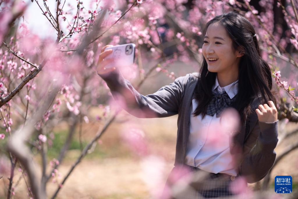 3月12日,游客在河南省焦作市温县黄河街道下石井村杏园赏花拍照。