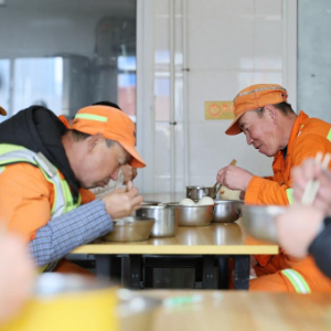 3月12日,环卫工人在天津市南开区长江道环卫职工之家就餐。