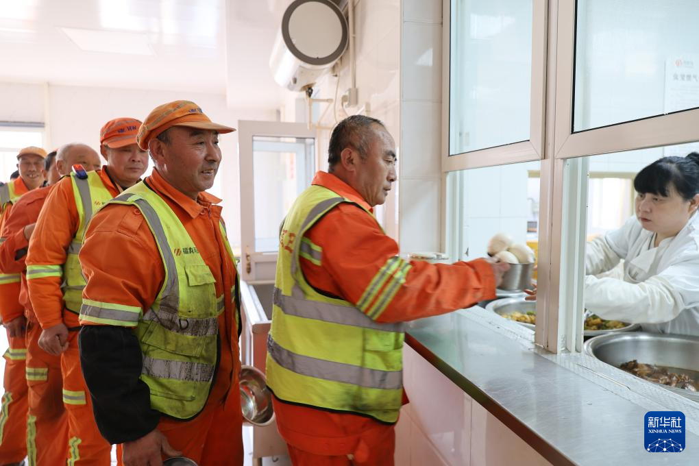 3月12日,环卫工人在天津市南开区长江道环卫职工之家排队打饭。