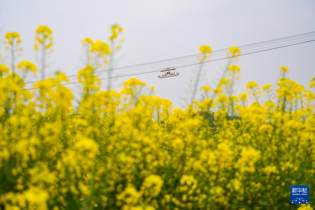 3月12日,游客乘坐观光缆车在重庆潼南崇龛花海景区游览。