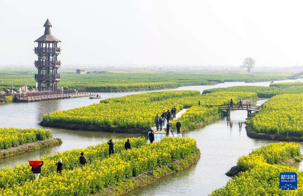 3月14日,江苏省兴化市千垛景区开园迎客,游客在景区内赏花游玩。