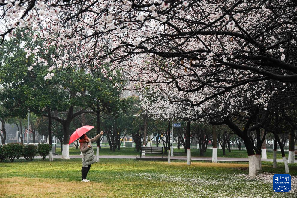 3月14日,在河南省济源市世纪广场,市民冒雨赏花。