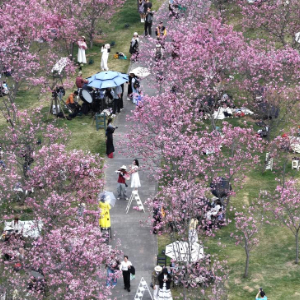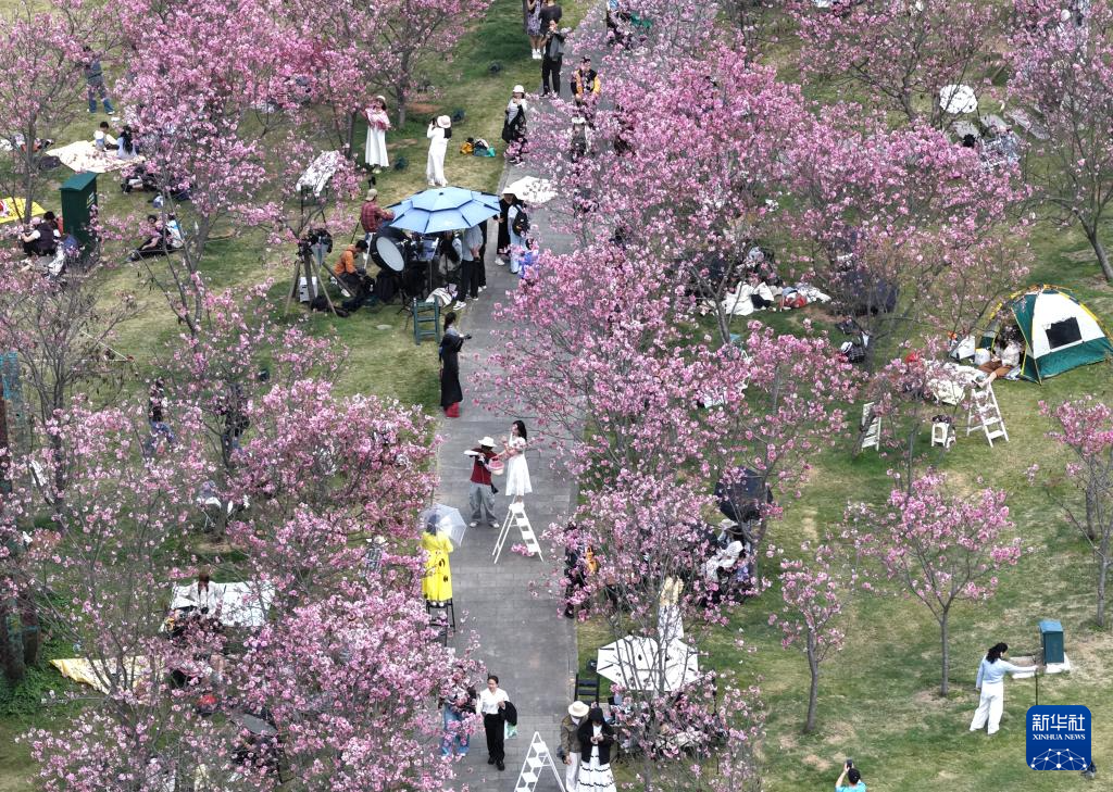 3月14日,市民在广西南宁市青秀山风景区樱花园赏花(无人机照片)。