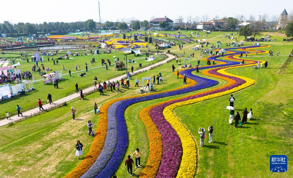 3月14日,游客在江苏省高邮市湖上花海景区赏花游玩(无人机照片)。