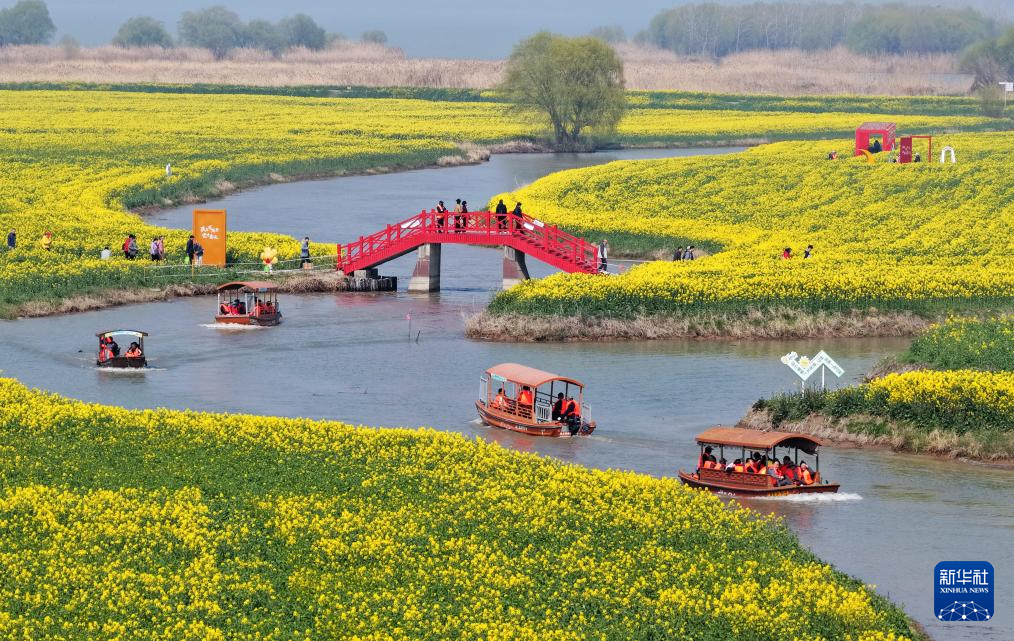 3月14日,游客在江苏省高邮市湖上花海景区乘船赏花(无人机照片)。