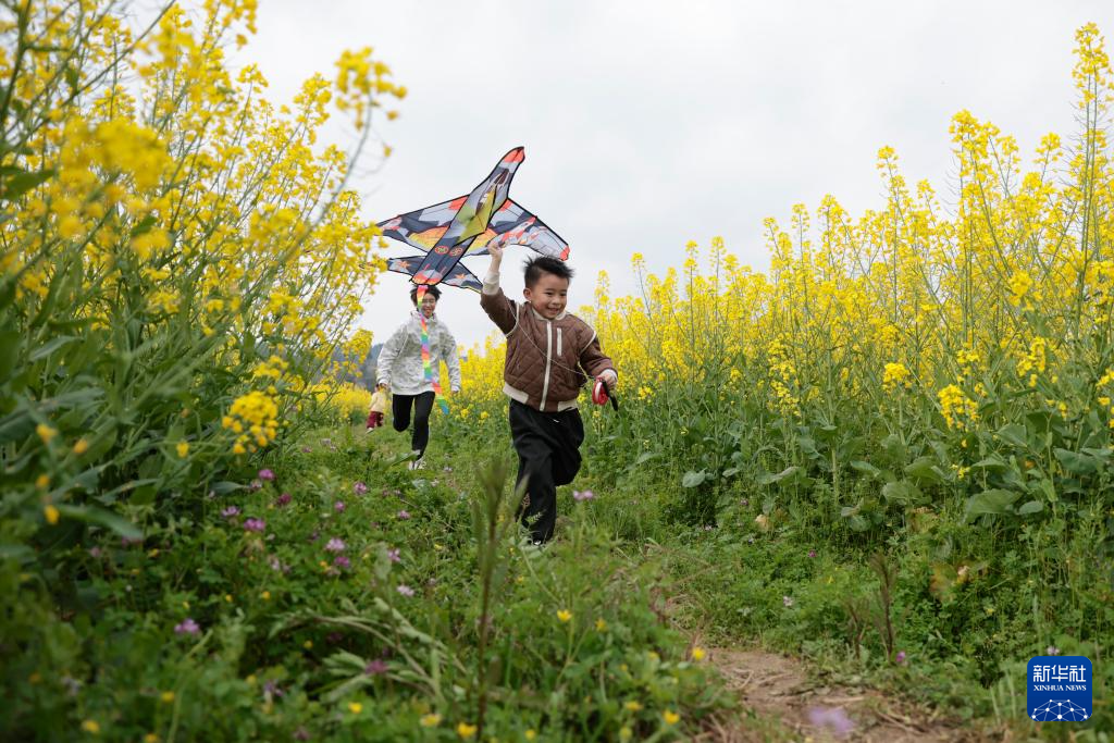 3月14日,小朋友在贵州省黔东南苗族侗族自治州施秉县城关镇上翁哨村油菜花田中放风筝。