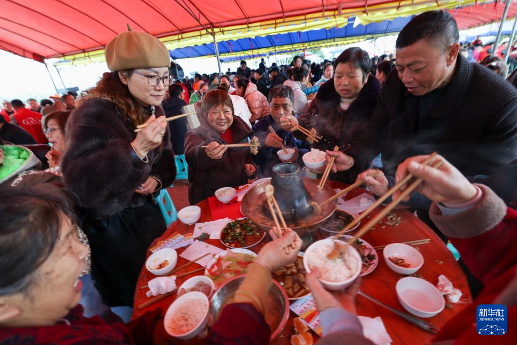 3月14日,游客在百家宴上品尝当地特色美食。