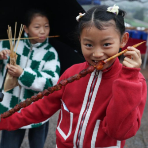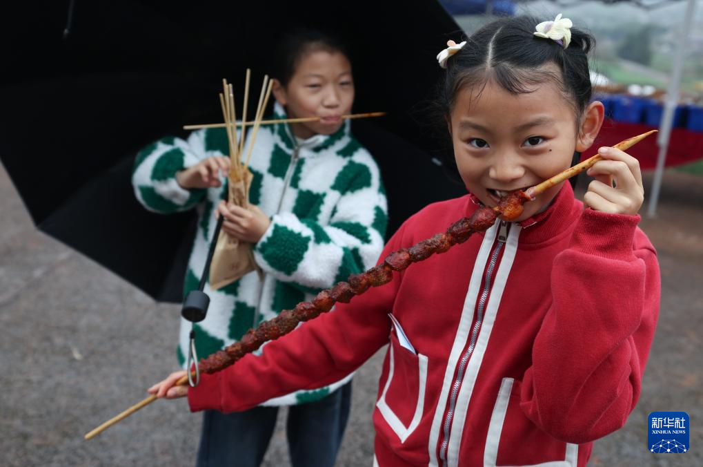 3月14日,两名小朋友在美食摊位品尝烤串。