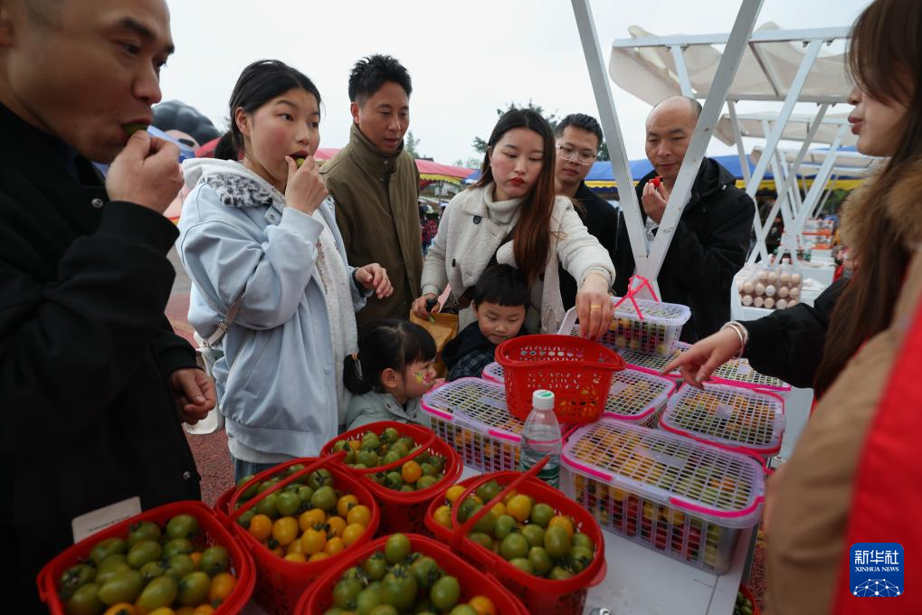 3月14日,游客在乡土集市上品尝小西红柿。