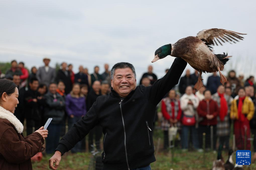 3月14日,一名游客在套鸭体验活动中展示“战利品”。