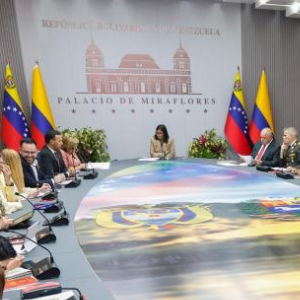 3月13日,委内瑞拉代总统德尔西·罗德里格斯(中)在位于加拉加斯的总统府与哥伦比亚代表团举行会晤。