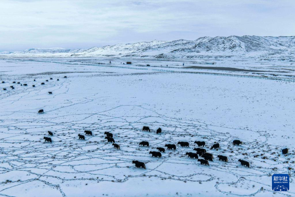 3月14日拍摄的阿坝县牧场雪景(无人机照片)。