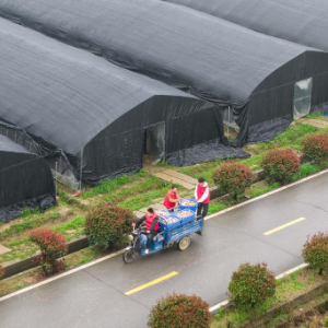 3月17日,在湖南省长沙市望城区靖港镇采丰蘑菇种植园,村民运输刚采摘的姬松茸(无人机照片)。