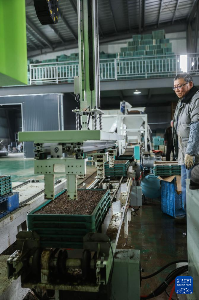 在位于慈溪现代农业开发区内的慈溪市腾丰省级现代化农事服务中心育秧中心,早稻种子在育秧流水线上被均匀放入育秧盘(3月17日摄)。