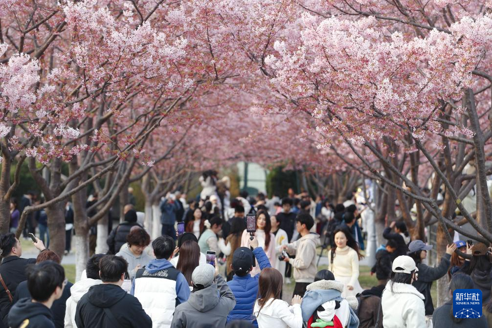 3月16日,人们在浙江省宁波市鄞州区文化广场观赏盛开的樱花。