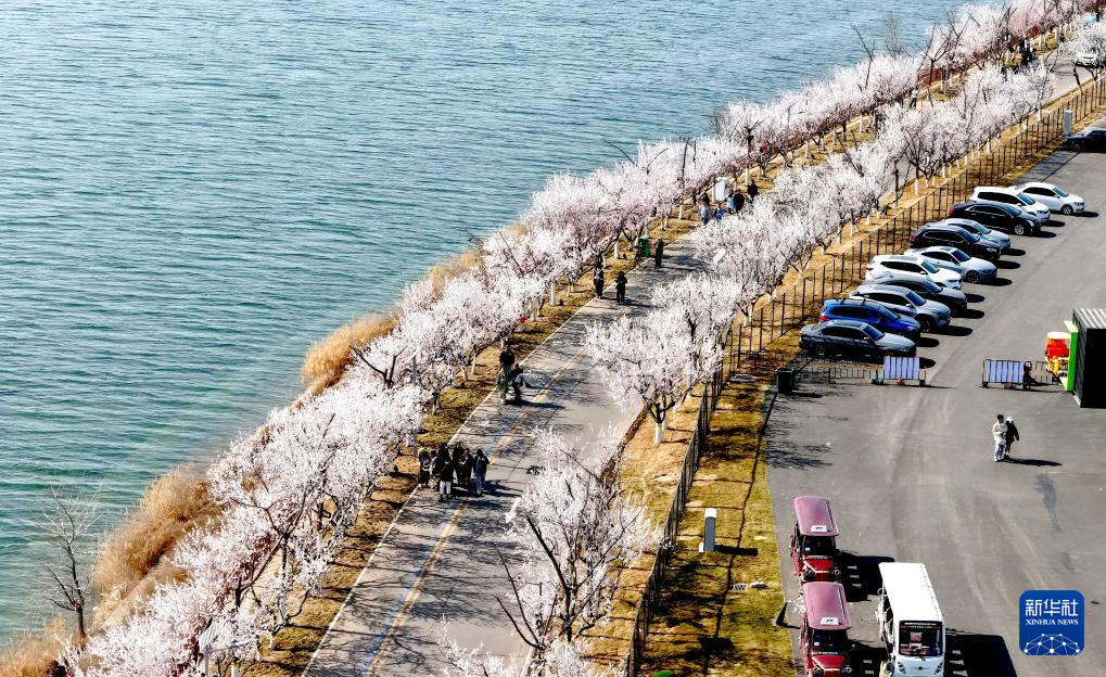 3月16日,游客在河北省石家庄市滹沱河畔赏花游玩(无人机照片)。