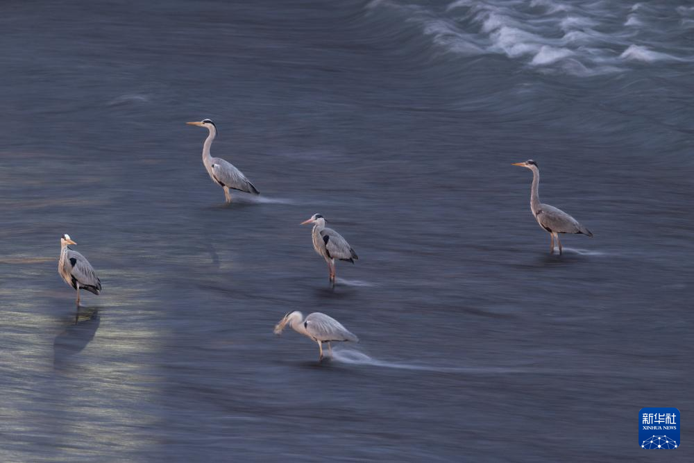 3月17日,几只鹭鸟在锦江河道中迎着逆流“站桩”觅食。