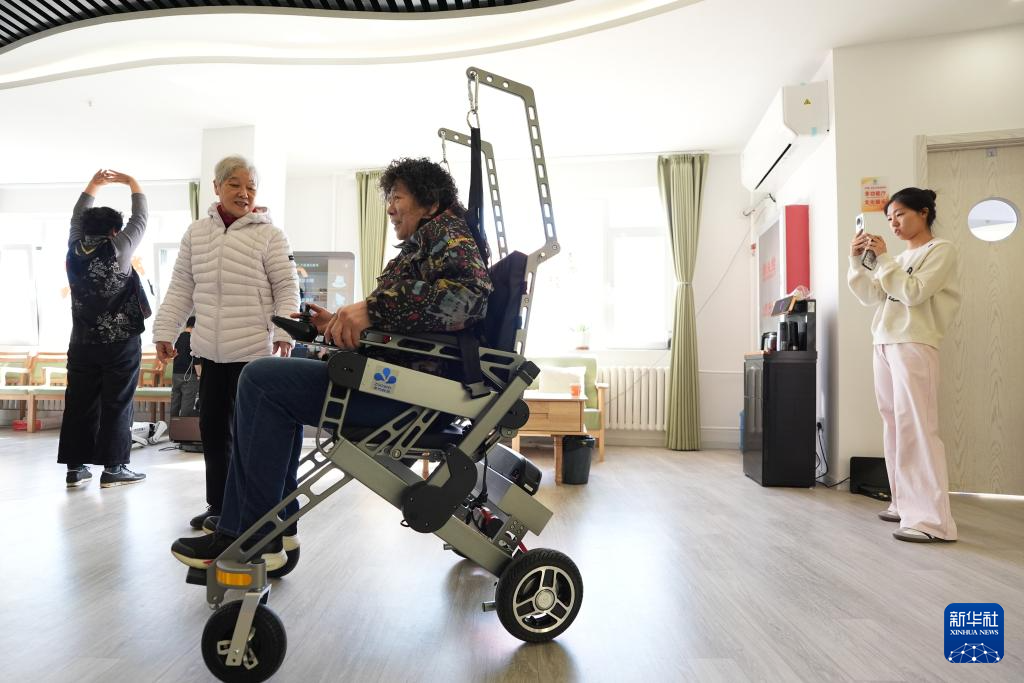 一名社区居民(前)在智慧康养机器人养老驿站内体验一款智慧健康设备(3月18日摄)。