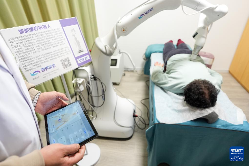 在智慧康养机器人养老驿站内,一名社区居民体验一款智能理疗机器人(3月18日摄)。