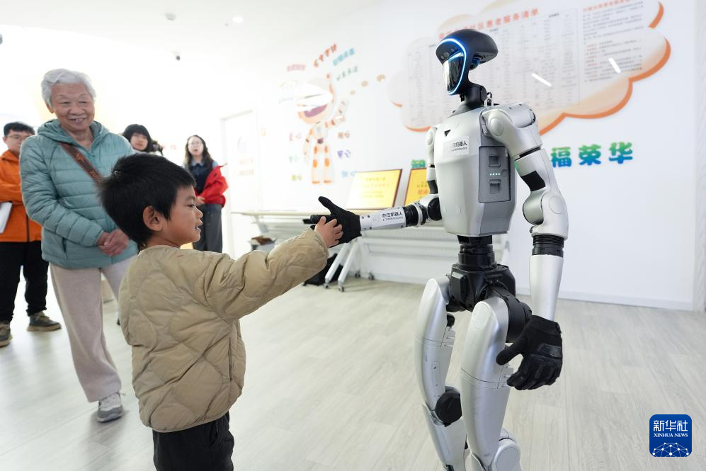 在智慧康养机器人养老驿站内,小朋友与一款人形机器人握手(3月18日摄)。