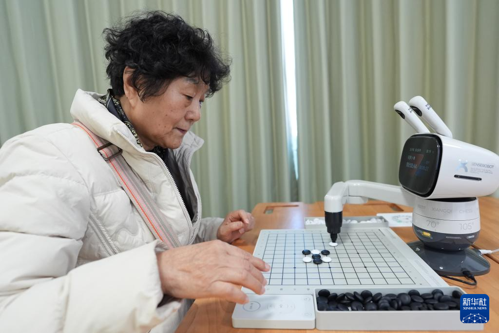 在智慧康养机器人养老驿站内,一名社区居民与一款机器人下五子棋(3月18日摄)。