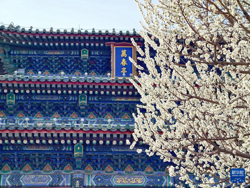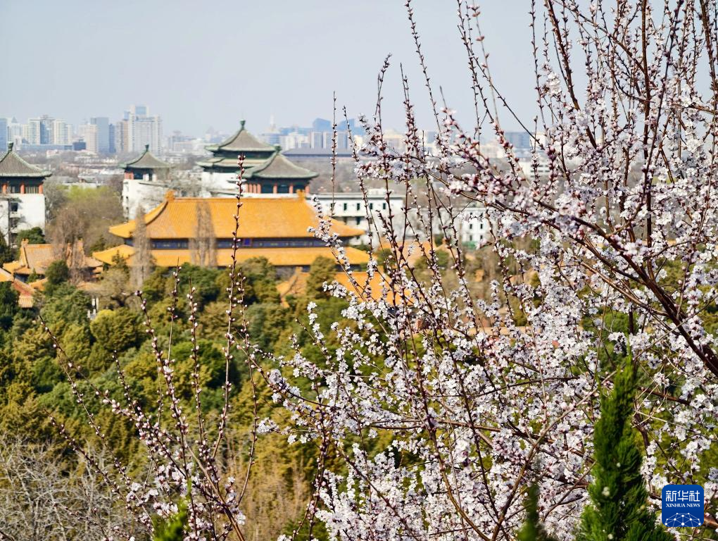 春分将至,景山公园春花绽放。古建与繁花相映成趣,吸引众多游客赏花留影。