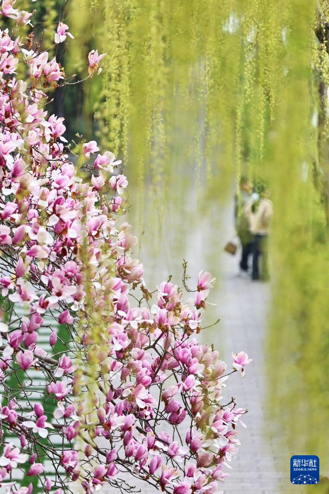 3月18日,人们在江苏省昆山市亭林园赏花拍照。