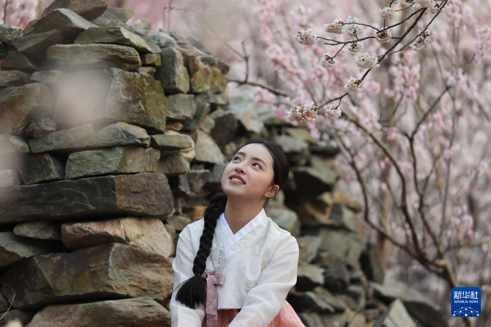 3月15日,游人在江苏省连云港市云台山景区樱桃谷赏花拍照。