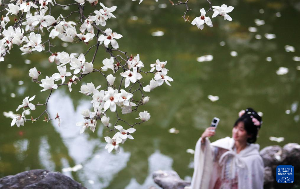 3月18日,游客在江苏省扬州市何园景区赏花拍照。