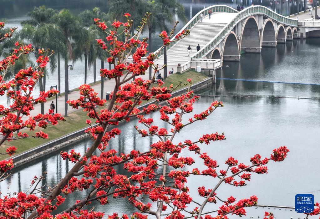 这是广西南宁市南湖岸边盛放的木棉花(3月19日摄,无人机照片)。