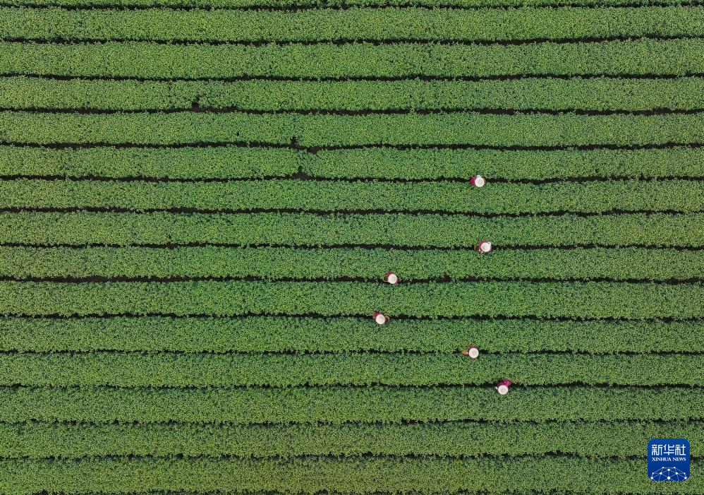 3月19日,梅家坞村的茶农在采摘西湖龙井“明前茶”(无人机照片)。
