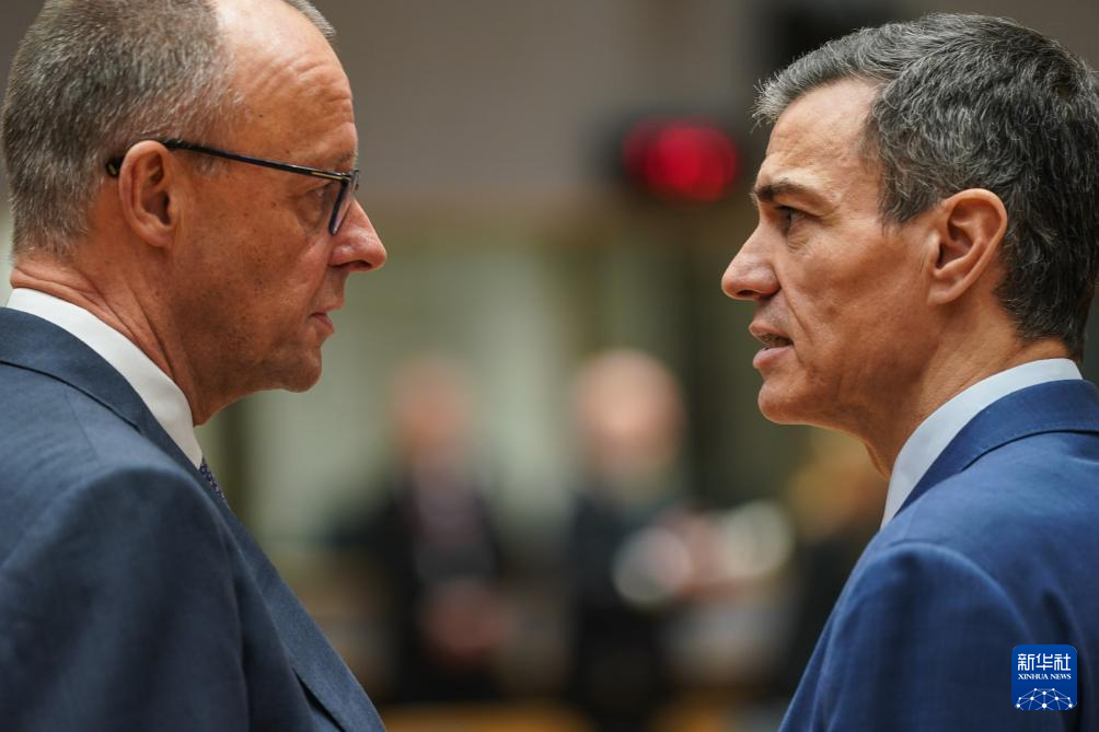 3月19日,在比利时布鲁塞尔,德国总理默茨(左)与西班牙首相桑切斯在会前交谈。