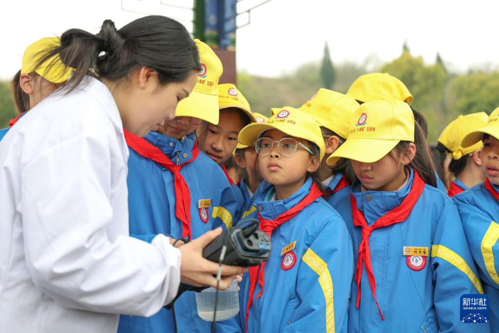 3月20日,在重庆市永川区神女湖边,工作人员向参加“世界水日”“中国水周”科普实践体验活动的红河小学“小黄帽”志愿服务队的同学介绍水质检测流程。