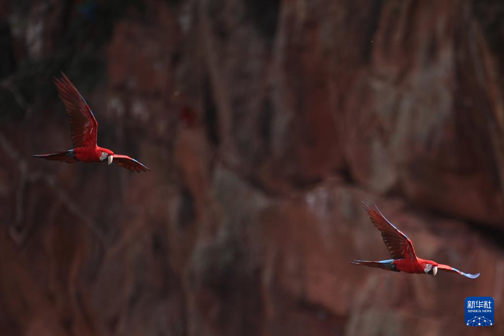 3月19日,金刚鹦鹉在巴西南部南马托格罗索州雅尔丁市的“金刚鹦鹉洞”飞翔。