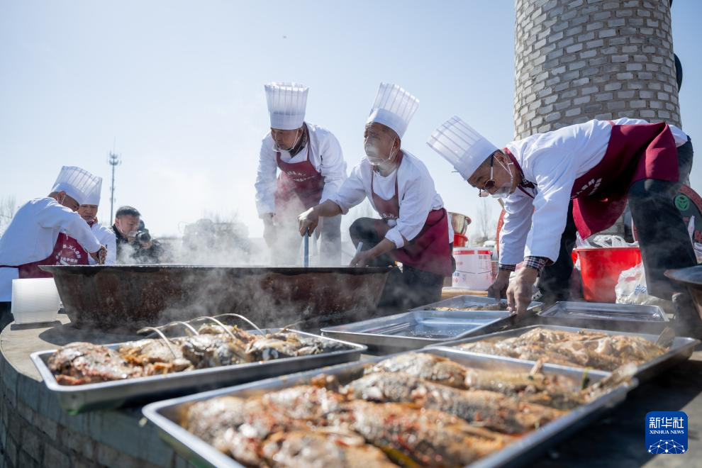 3月20日,厨师在呼和浩特黄河开河民俗文化周活动现场炖鱼。