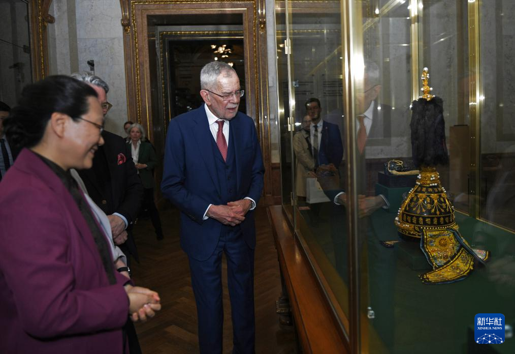 3月19日,奥地利总统范德贝伦在奥地利维也纳艺术史博物馆参观“美美与共——紫禁城生活藏美”展览。