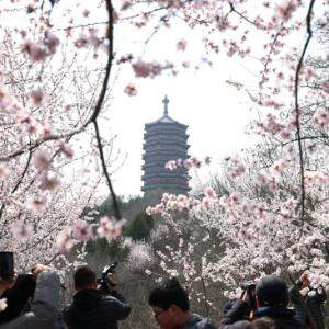 3月21日,市民在河北省石家庄市新华区水上公园拍照。