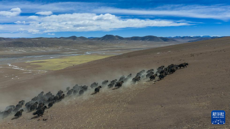 野牦牛群在藏色岗日冰川附近奔跑(无人机照片,3月10日摄)。