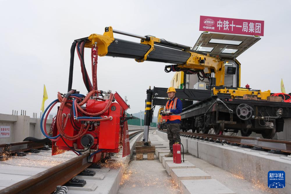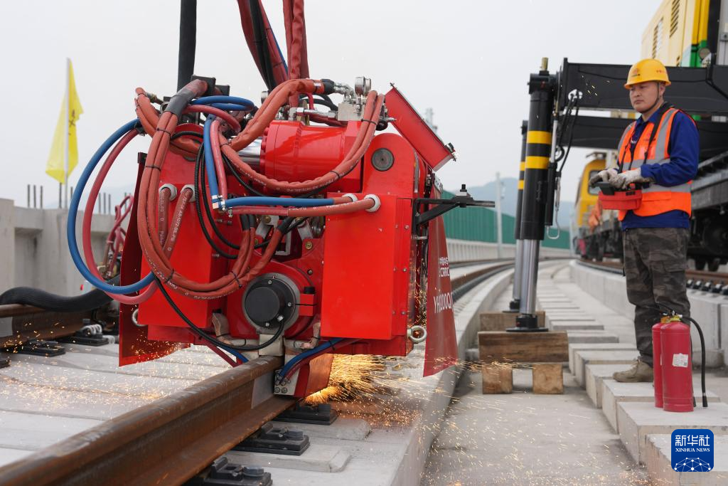 3月22日,在杭州至德清市域铁路施工现场,中铁十一局技术人员操作新能源多场景闪光焊轨机开展焊接作业。
