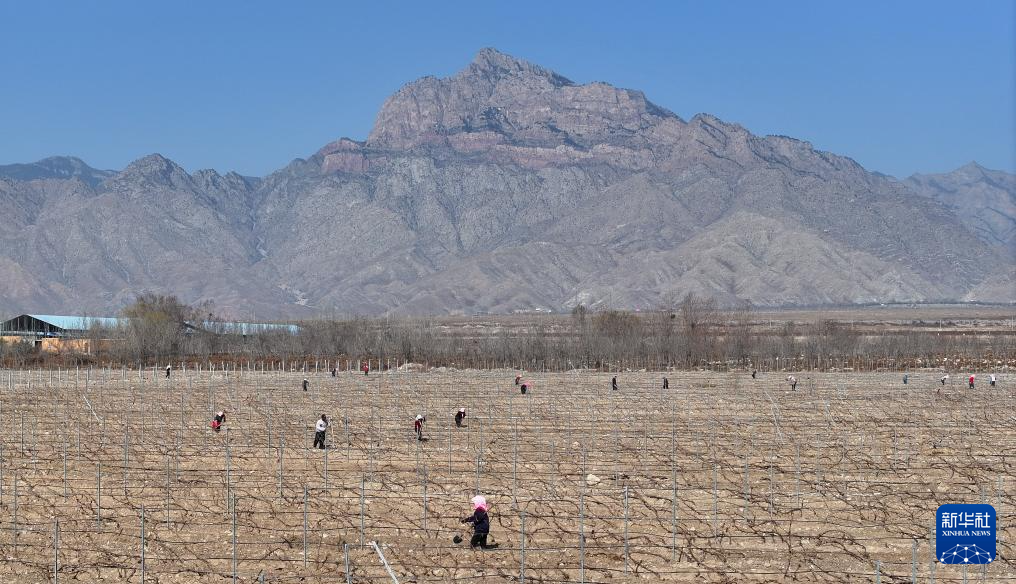 3月23日,工人在贺兰山东麓酿酒葡萄种植基地为葡萄展藤。