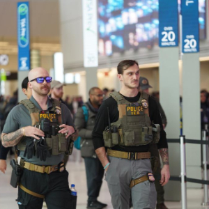 3月23日,移民与海关执法局的执法人员在美国纽约拉瓜迪亚机场的出发安检处执勤。