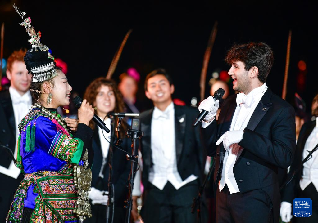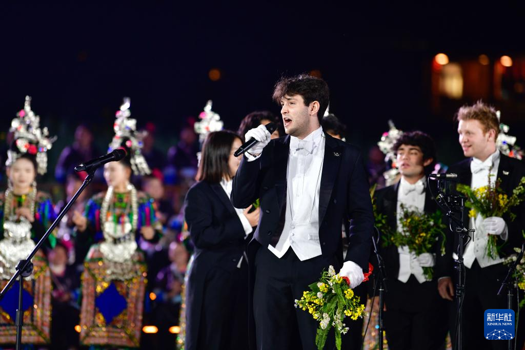 3月23日,在贵州省黎平县肇兴侗寨,美国耶鲁大学威芬普夫斯阿卡贝拉合唱团与贵州“村歌”合唱团同台演唱歌曲。